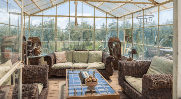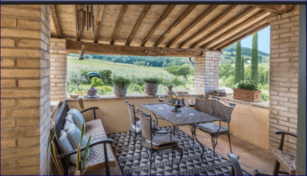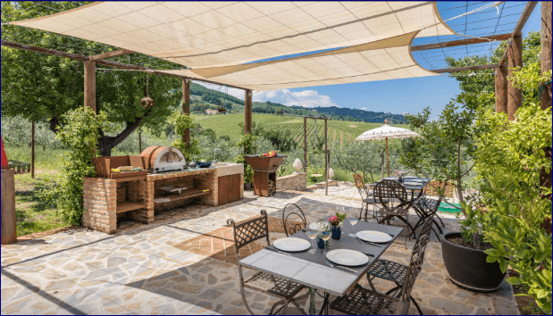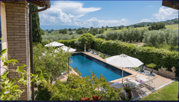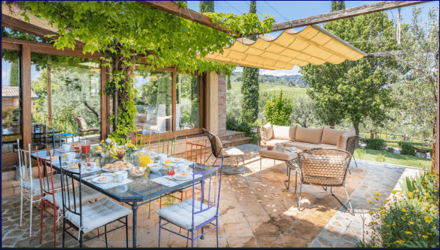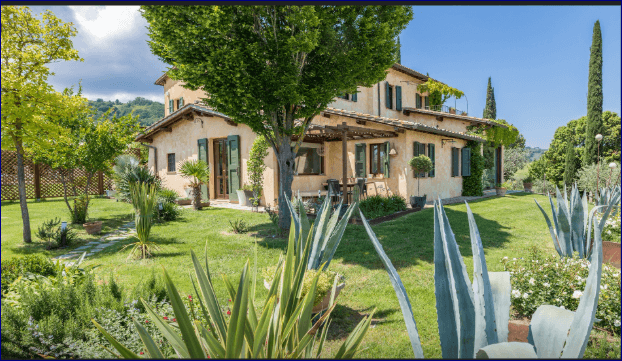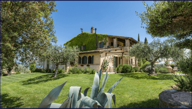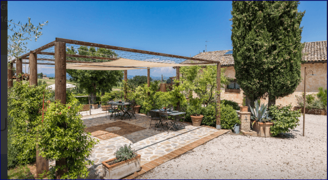 הבית מגודר לחלוטין, ממוקם באזור פנורמי במיוחד מול אסיזי. הגינה הנפלאה והמטופחת בה שוכן הבית משתרעת על פני כ-3000 מ"ר עם מטעי זיתים,. מתחת לפרגולה, הממוקמת בנוחות מול המטבח, נמצאת פינת אוכל מרוהטת בשולחנות, כיסאות, ספה וכורסאות. החלונות הצרפתיים הגדולים של הסלון מובילים לאזור מנוחה עם שולחן וכיסאות ובקומה הראשונה של הבית, בראש המדרגות החיצוניות, נמצאת מרפסת יפהפייה מרוהטת בספה, שולחן וכיסאות. במרחק מטרים ספורים מהבית יש פרגולה פנורמית גדולה מעץ עם סוכך המצוידת בשולחן, כיסאות, מנגל עצים מפלדה עם פלטת בישול מפלדה, תנור פיצה חשמלי, משטח עבודה וכיור.