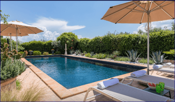 בריכת השחייה המפוארת, המוגנת בצד אחד על ידי גדר חיה, ממוקמת מול הבית, הנמצא במרחק של 5 מטרים בלבד וניתן להגיע אליה ישירות מהכניסה הראשית. הבריכה המלבנית, בגודל 12 על 6 מטר ועומקה נע בין 1.20 ל-1.40 מטר, מרופדת בחרסינה אפורים כהים, כדי להעניק לבריכה מראה טבעי ככל האפשר, וכוללת תאורה פנימית, טיהור כלור (עם ניטור מתמיד כדי לשמור על ערכי הכלור מינימליים תמיד) ו-5 מדרגות שקועות לגישה למים. הסולריום, עשוי טרקוטה וטיק, מצויד במיטות שיזוף, כורסאות, שמשיות ומקלחת סולארית. בריכת השחייה פתוחה מהשבת האחרונה של אפריל ועד השבת הראשונה של אוקטובר